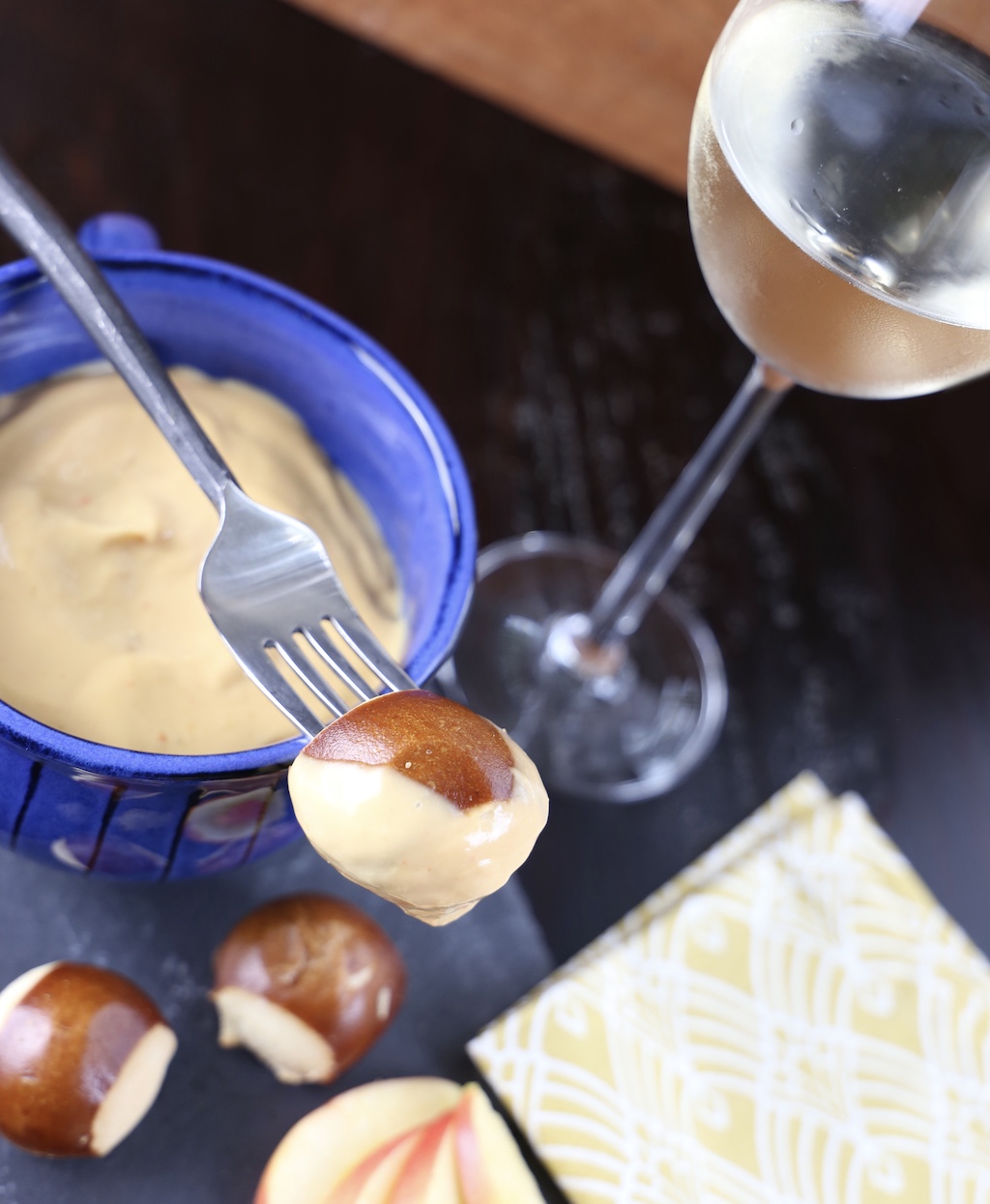 - Slowly incorporate the wine into the melting cheese.