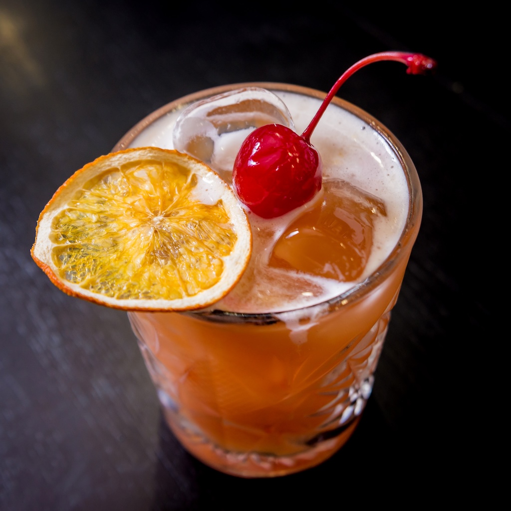 Mix Giffard with light and dark rum in a cocktail shaker, add lime juice and grenadine. Shake well and strain into a highball glass filled with cracked ice. Fill the glass with orange juice, but leave enough room to float the OFTD rum on top. Garnish with a cherry and an orange slice.