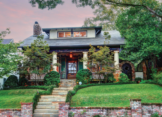 Most of the houses in The Heights began as quaint Georgian and Tudor bungalows. Sadly, the “McMansions” started springing up in the late 1990s. Thankfully, the tide seems to be turning, with new owners remodeling the older homes instead of razing and rebuilding. While there were tons of homes in The Heights that caught our eye, this one has all the elements we love in a bungalow: stone chimney, columns and a deep porch that calls out for cocktails during happy hour.