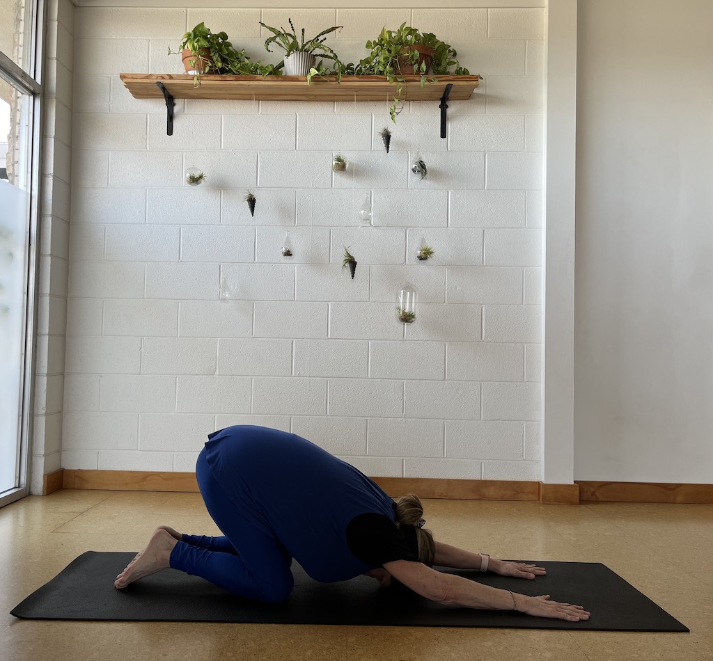 Instructions: Start on all fours. Take your hips toward your heels and place your arms by your sides. Move forward and backward to get comfortable while being gentle on the knees. Relax your body and breathe.
