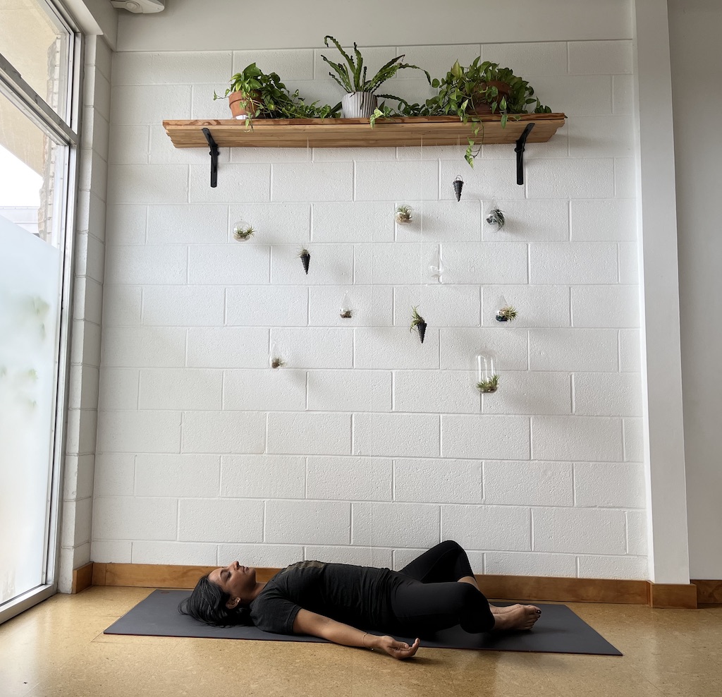Instructions: Sit on the floor with your left side against the wall. Turn to the left and bring your legs up as you lower your body into a prone position, with your shoulders and head resting on the floor. Scoot your bottom to lie flat against the wall.