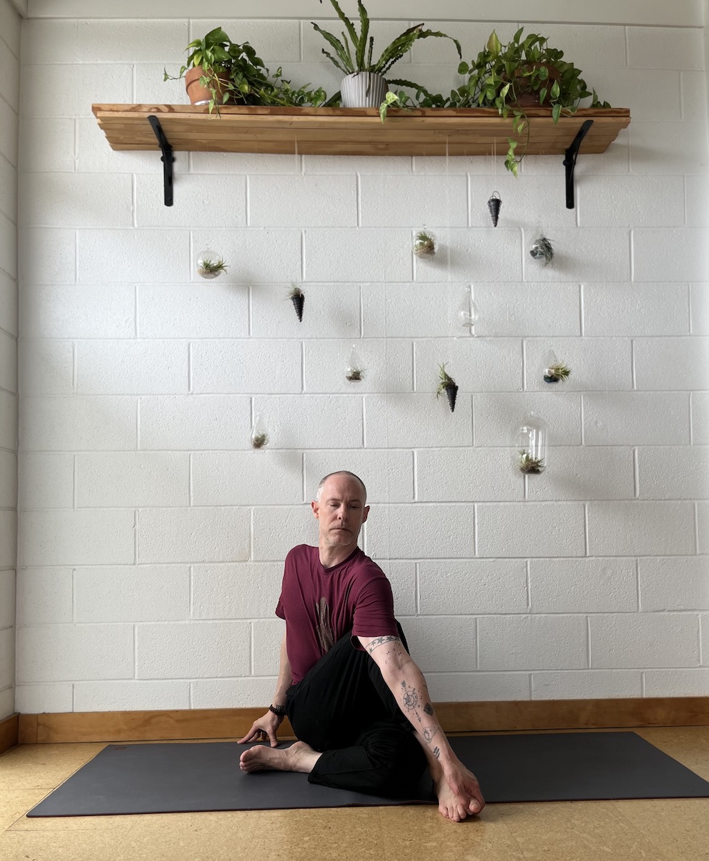 Instructions: Sit cross-legged on the floor and breathe deeply. On the exhale, slowly twist your body to look over your right shoulder while placing your left hand on your right knee and your right hand behind your body. Hold the stretch, then switch sides.