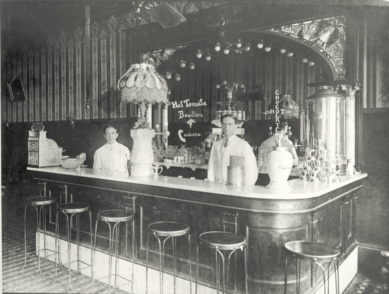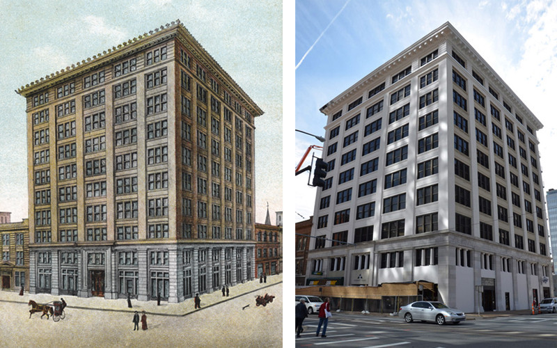 Before it housed the Green Corner Store, the Lincoln Building — built in 1905 — was home to a number of other businesses, including Dawson Drug Store. Compare the historical and current views by moving the slider across the image.