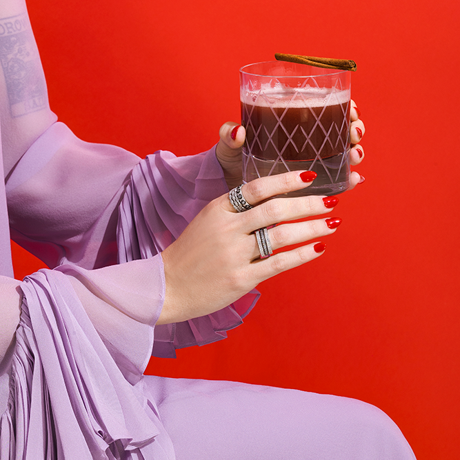 Dry shake, add ice, shake again and pour. Top with a cinnamon stick.
