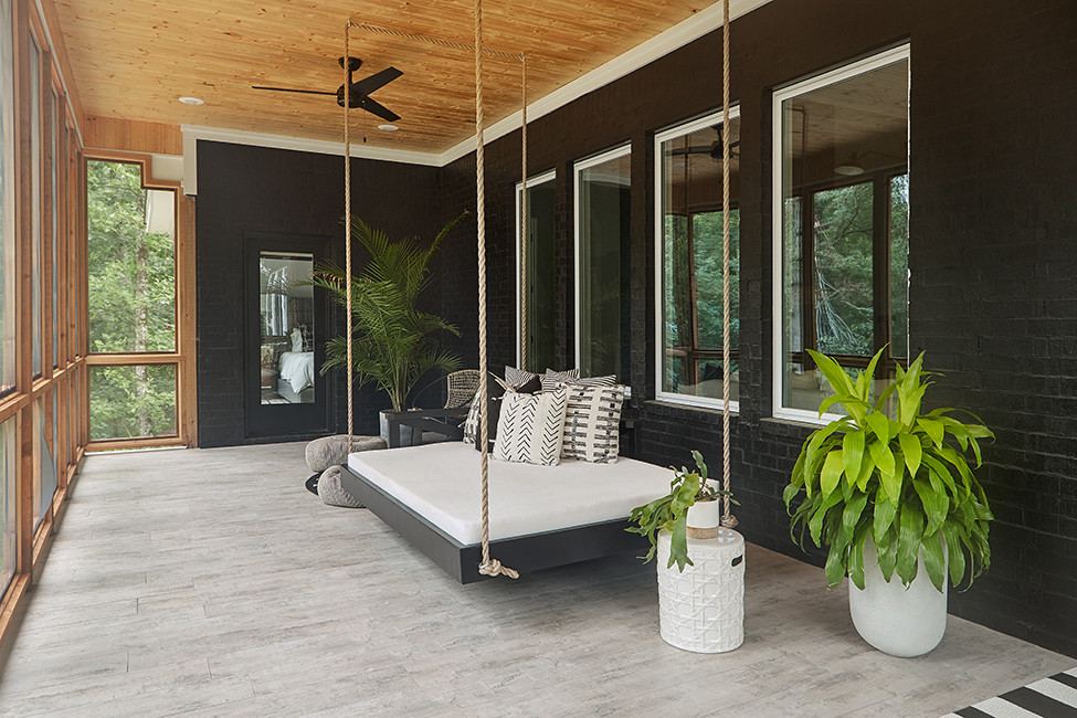Off the main living space is the family’s beloved screened-in porch overlooking the pasture and horses. The porch, which is also accessible from the master suite, features wood trim and a rope-hung swing that add a farmhouse feel to this modern home.