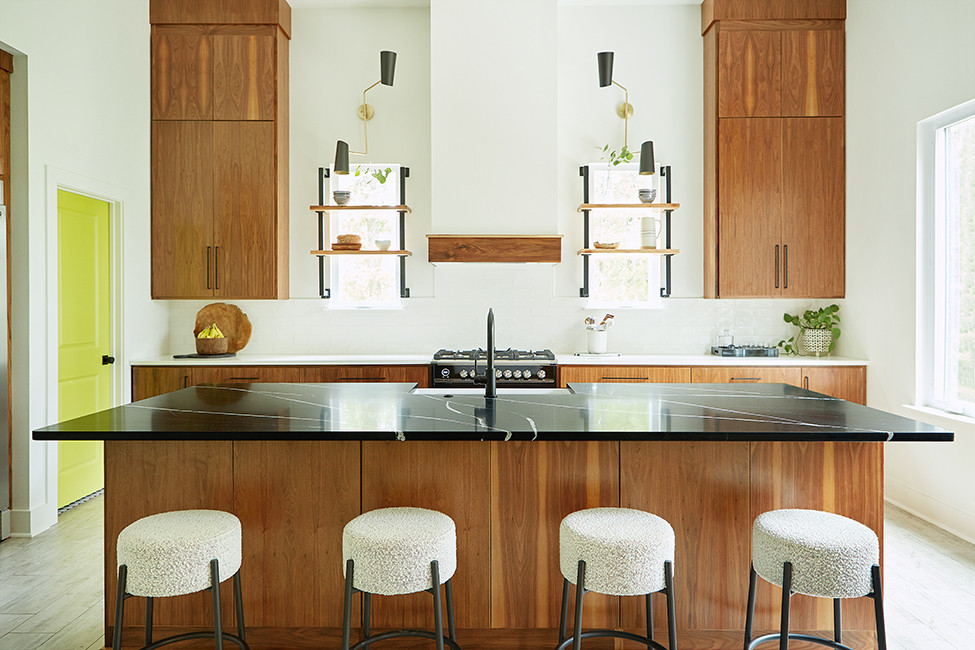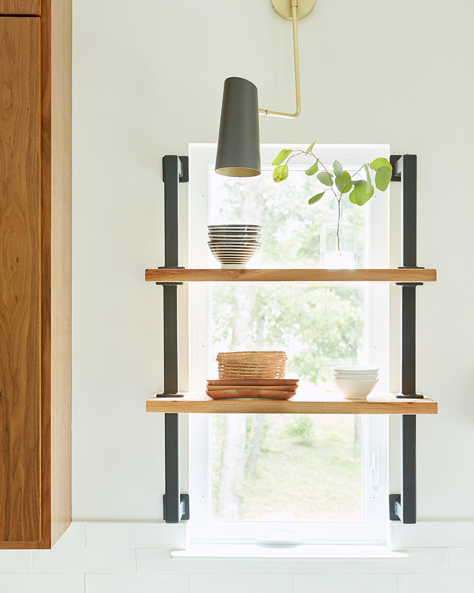 The kitchen windows are layered with walnut floating shelves with custom metal supports.