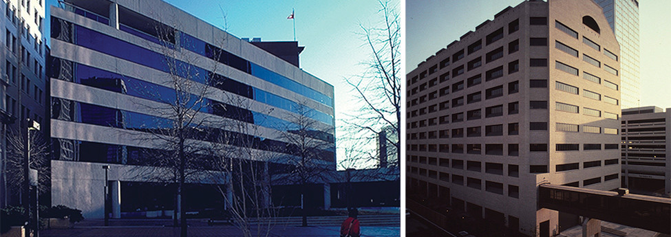 Both of these buildings in downtown Little Rock were designed by WD&D in 1980. The Atkins Insurance Building on the left, “a modem, triangle shaped office building of steel frame construction,” later became known as 2 Union National Plaza and was home to many state government offices.
