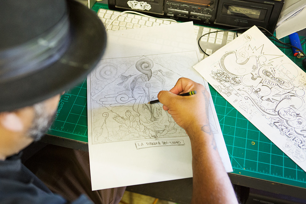 Hernandez mostly uses spray and acrylic paints to craft large-scale murals, canvas paintings, screen prints and graphic design projects. But he also likes “3D projects” like masonry, iron work, wood sculpting and casting.