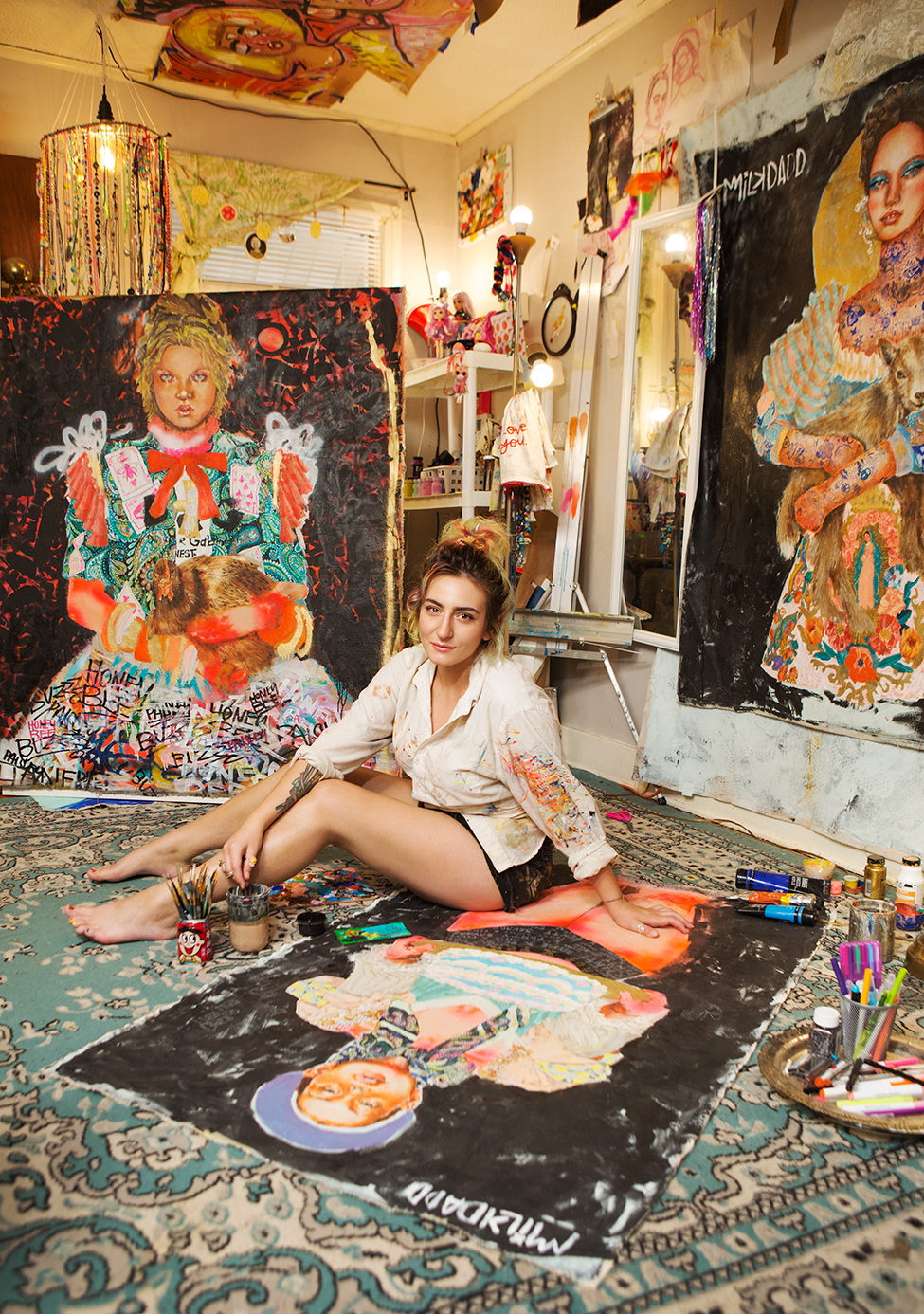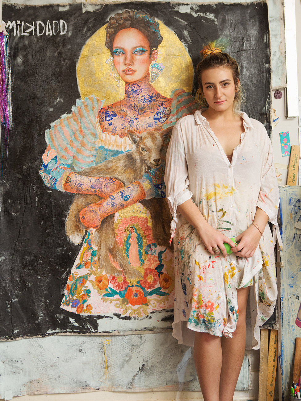 Milkdadd works with everything from acrylic and spray paint to nail art, rhinestones and embroidery. She creates her pieces on drop cloths, which started because of their affordability, but became part of her style. Much of her work focuses on faces, details, patterns and fashion.