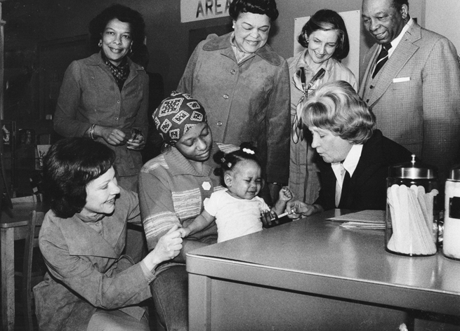 World Health Day, 1974, features (top row, from left) Dr. Roz Epps, Benetta Washington (Mrs. Walter Washington), Betty Bumpers, and Washington D.C. Mayor Walter Washington, along with (second row, from left) Rosalynn Carter, a D.C. mother and child, and an unidentified public health nurse.