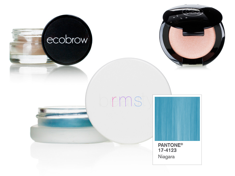 Clockwise from top left: Ecobrow defining wax in Sharon, Rituel de Fille luminizer in Rare Light and RMS Beauty organic eye polish in Inspire, all from Winc Beauty