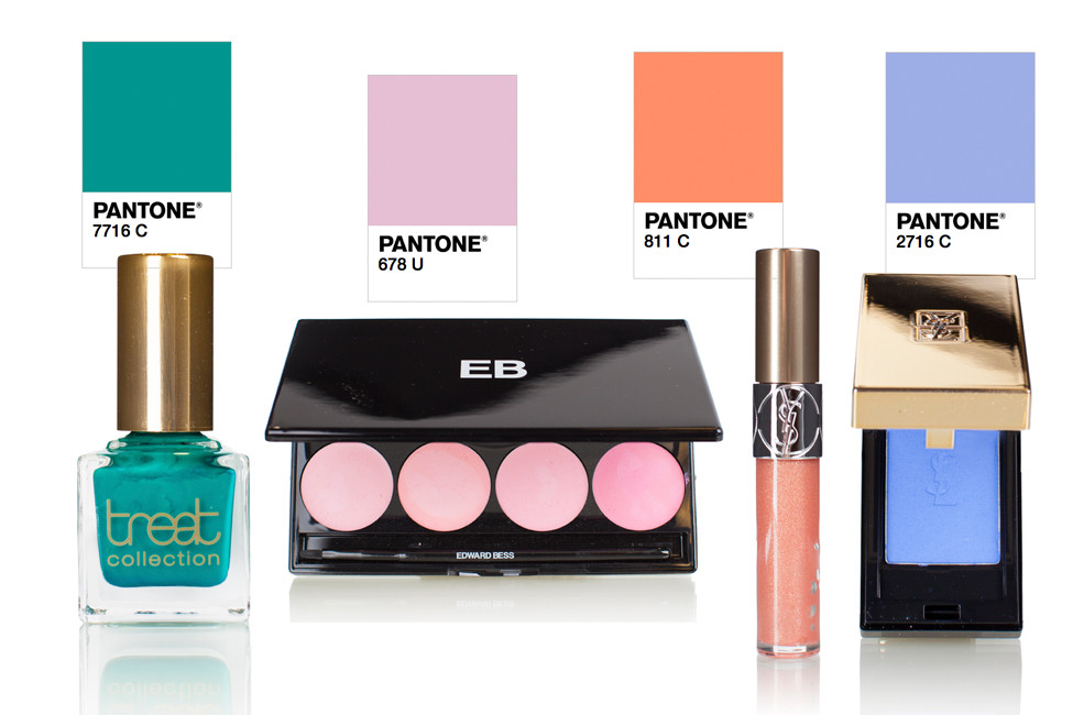 From left: Treat Collection nail polish in Outdoors, Edward Bess blush in Baby Pink, Yves Saint Laurent lip gloss in Golden, and Yves Saint Laurant eye shadow in Couture Mono, all from Barbara/Jean