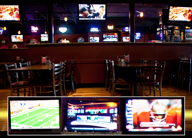 But the edge in this category goes to West End. The place is huge with an elevated bar section, a billiards room, shuffleboard, couches and even a stage for live bands (don’t worry, they’re not going to play until after the game). Patrons can play satellite trivia with other customers in the bar and across the nation. And with 56 TV sets, ranging from kitchen-sized to giant projection theater screens, you’re not going to miss one play.