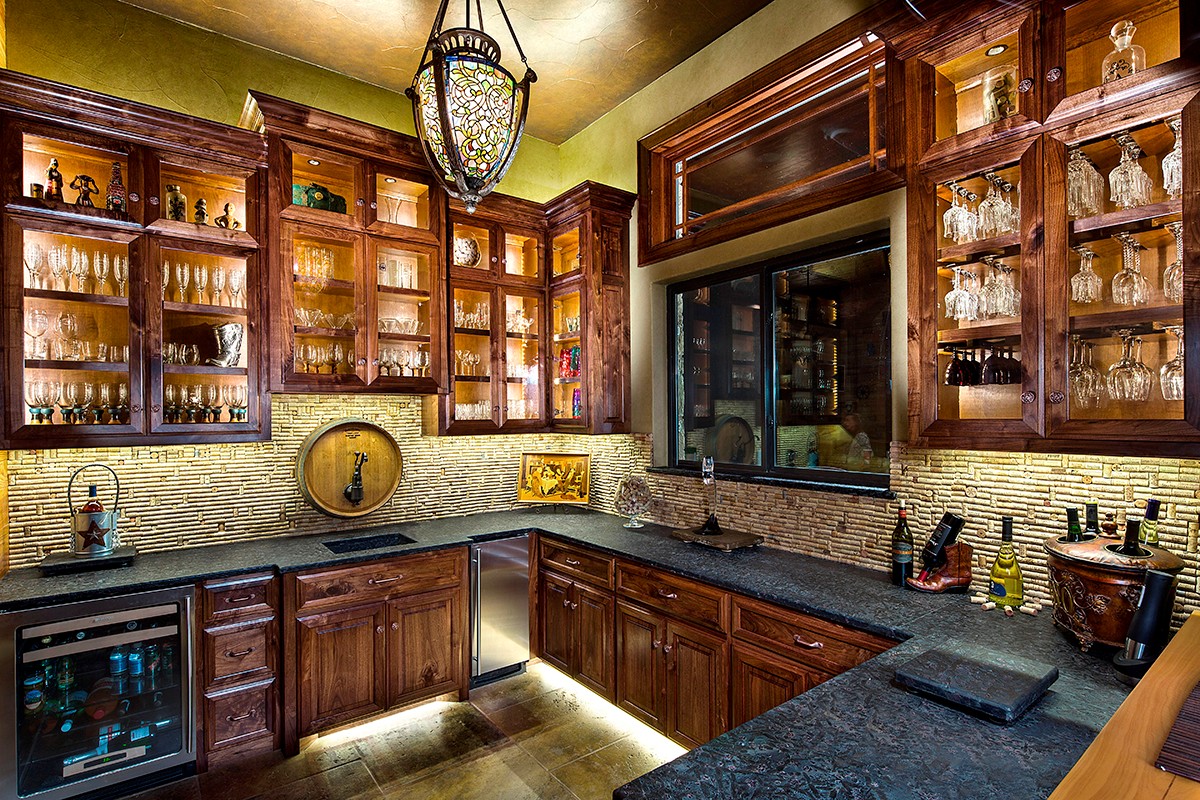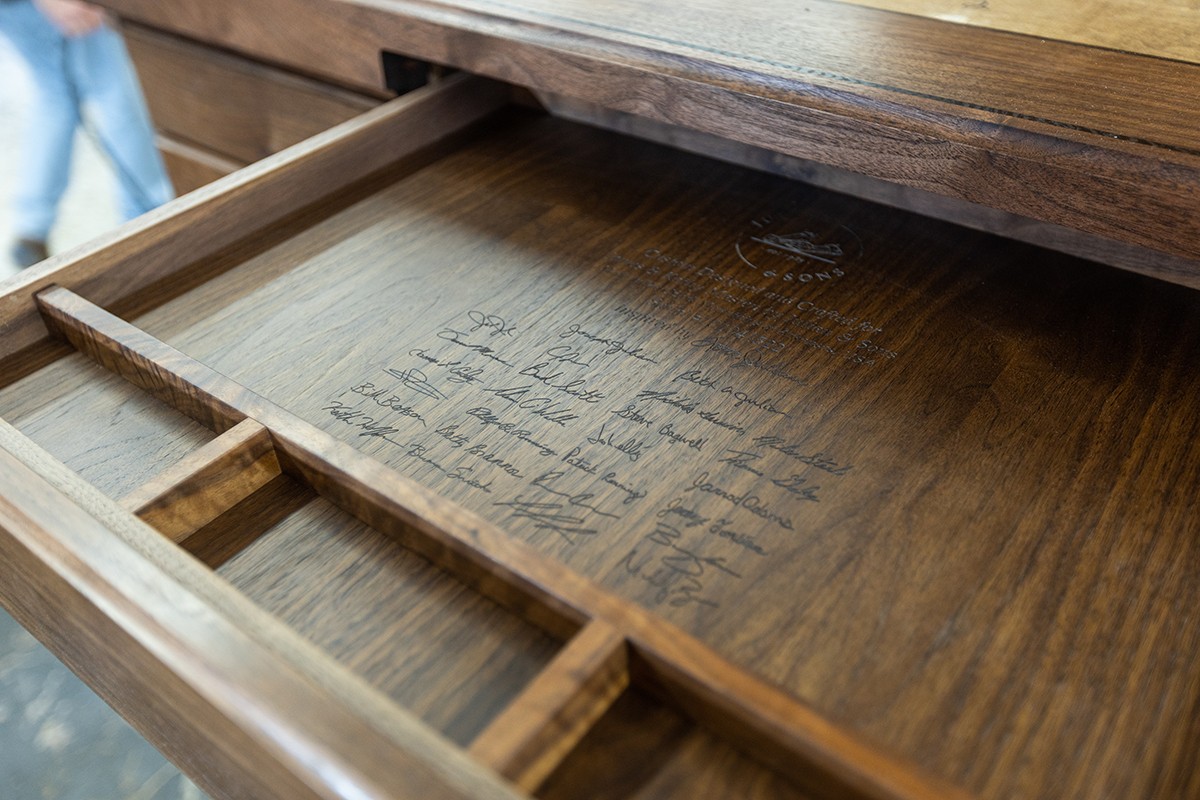 When it comes to entire rooms, Julian and Sons generally works with local contractors for the building of the sub-structure and coordinating with the mechanical sub-contractors. Once a room or a piece is installed on-site, the Julian and Sons craftsmen will put on one final coat of finish as the product is completed. Whether it‘s a gun room, trophy room, library, wine room, study or kitchen, the job isn‘t truly complete until everyone has signed the inside of a door or drawer on every project the company does. ”Everybody in our company signs it, including the person who sweeps the floors and answers the phones,” Joe Julian says.