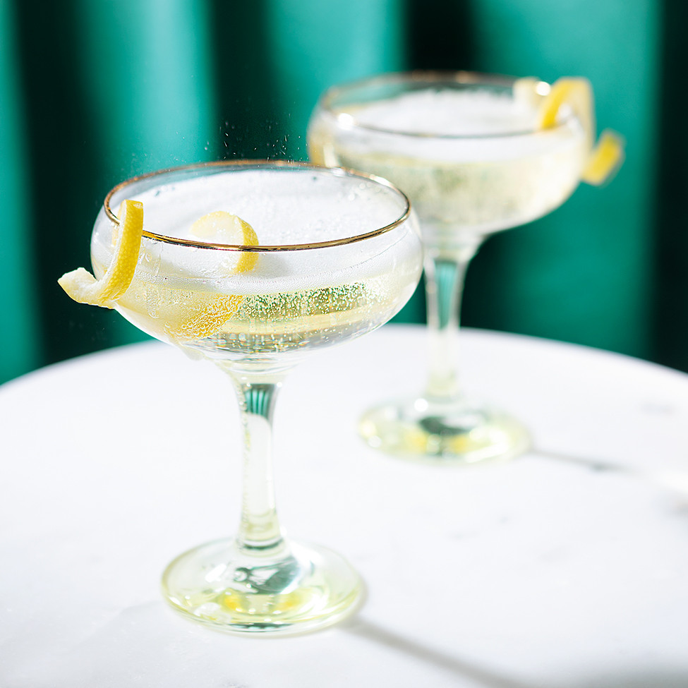 Shake gin, lemon juice and simple syrup with ice. Strain into a champagne flute and top with sparkling wine. Garnish with a twist of lemon and serve.