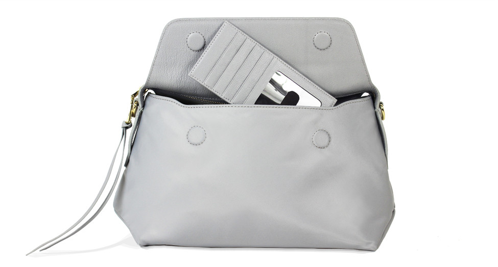 • Beautiful satin nylon with leather trim in Concrete Jungle Gray is an exciting trending neutral that will pair well with any outfit. This gray is an investment color you can carry all seasons and for years to come.