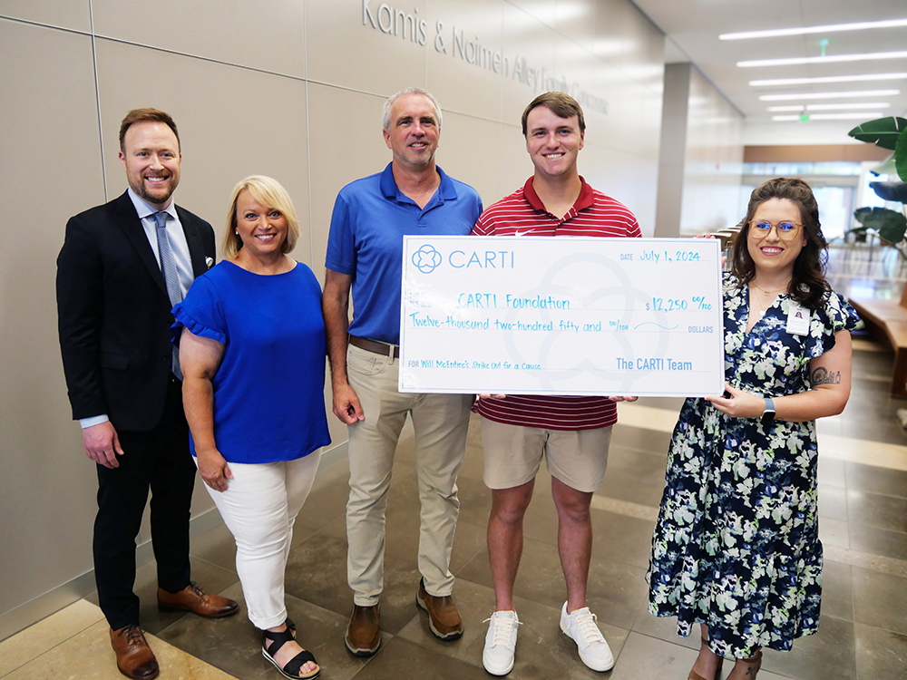 Diamond Hog pitcher and Bryant native Will McEntire presented a $12,250 donation to CARTI, the result of his “Strikeouts for a Cause” campaign that pledged $5 per strikeout to the center’s Patient Assistance Program in honor of his father’s own cancer journey.