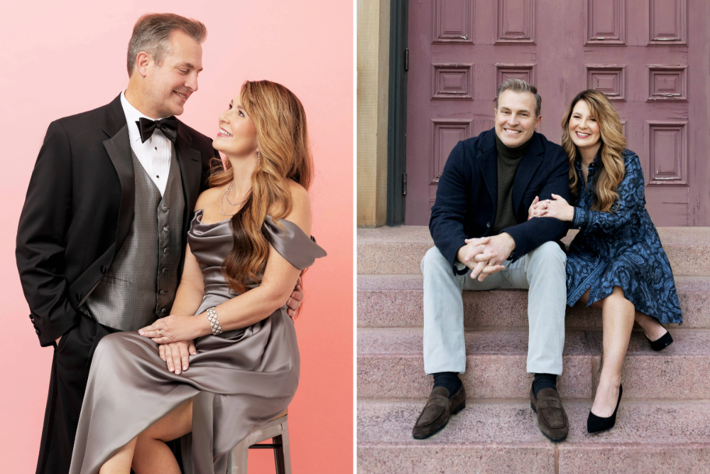 RIGHT // On Lanny: Marco Pescarolo pant, Munro turtleneck, Fedeli jacket, Tod’s loafers from Baumans Fine Men’s Clothing. On Colleen: Versace silk dress, Marion Parke pumps from Barbara/Jean. Diamond flower earrings, floral drop necklace from Sissy’s Log Cabin.