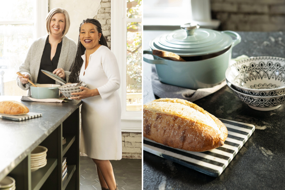 RIGHT // Le Creuset dutch oven, wooden ladle, dish towel, stamped bowls, marble board from Eggshells Kitchen Co. Shot on location at the E.O. Manees House.