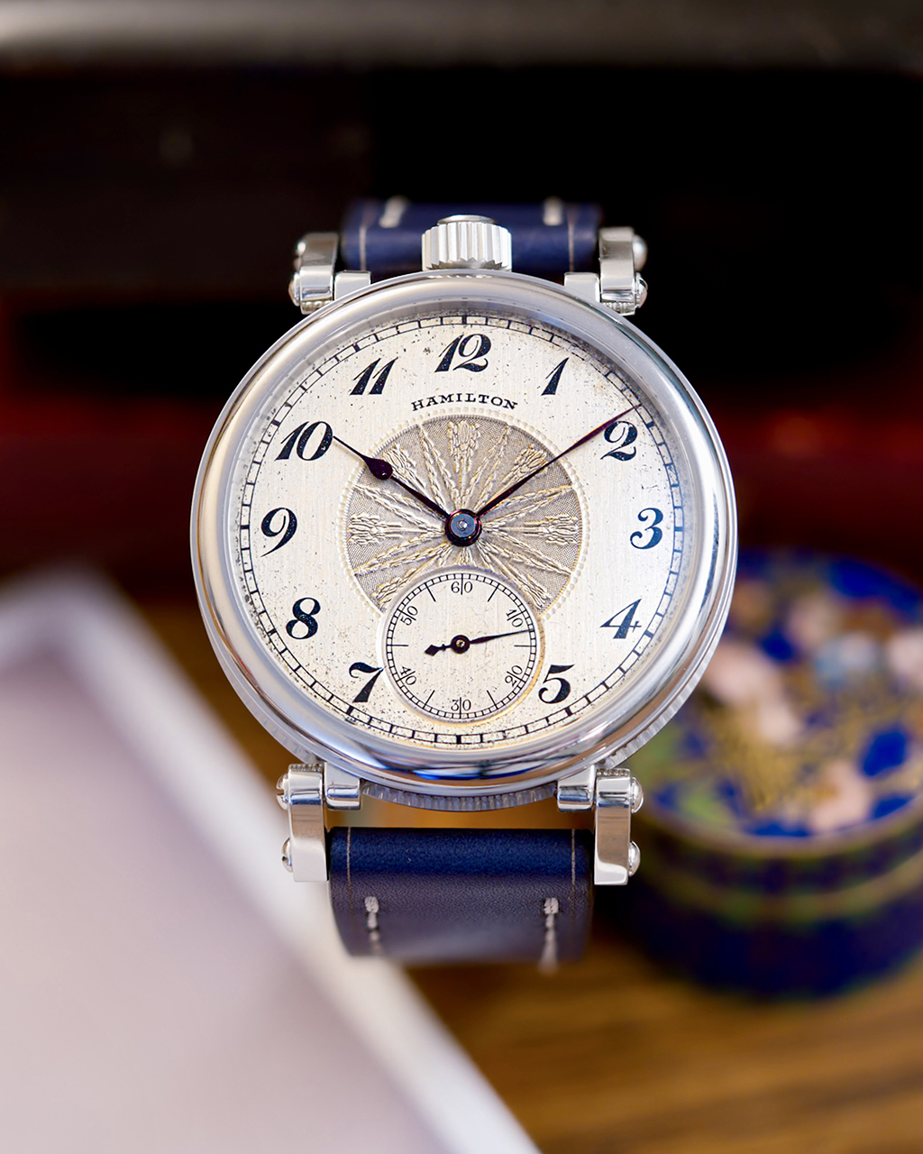 KF: I’ve kept just one of our 36 mm conversions, and while I appreciate its history, my interest is mainly aesthetic. It’s a Waltham with a beautiful fancy dial with cobalt blue accents and matching blue strap.