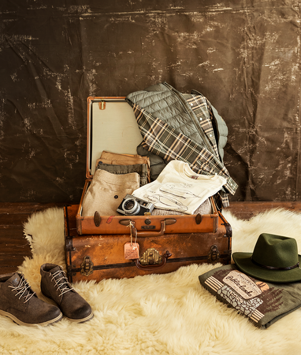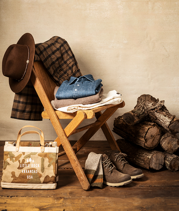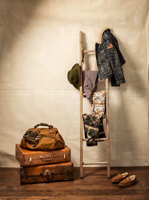 Polo Ralph Lauren jacket, flannel, slippers from Dillard’s. Pendleton hat + flannels, Filson duffle pack + bandana from Domestic Domestic. Suitcases from Galaxy Office Furniture.