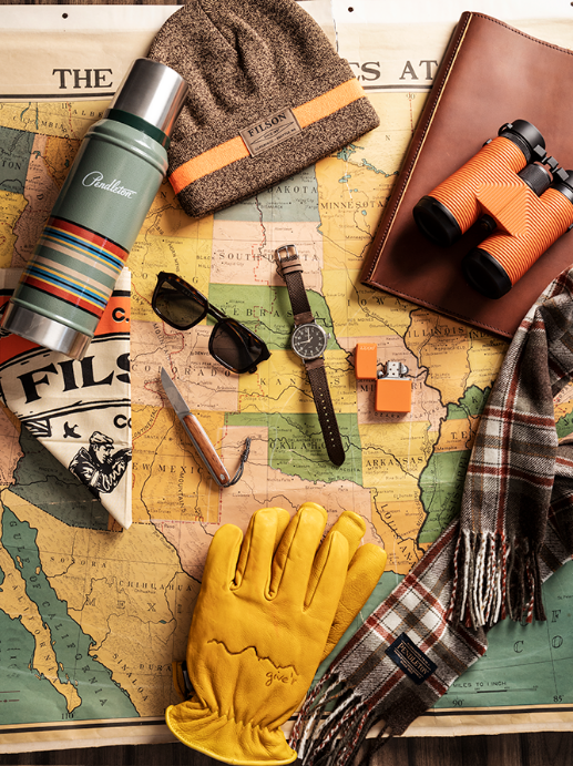 Filson bandana + beanie, Pendleton thermos + scarf, Raen sunglasses, The James Brand folding knife, Timex watch, Zippo lighter, Nocs Provisions binoculars, Rustico leather padfolio, Give’r classic gloves from Domestic Domestic. Map from Sweet Home Furnishings.