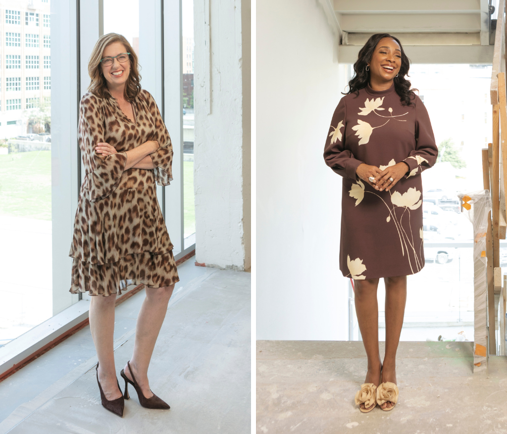 On Casey: One-shoulder draped dress by Gemy Maalouf from Unveiled Bridal Collection. Kara printed patent leather heels by Antonio Melani from Dillard’s. Jewelry from Sissy’s Log Cabin. On Maegan: Satin slouch dress by Amsale from Unveiled Bridal Collection. Kara kid suede leather heels by Antonio Melani from Dillard’s. Jewelry from Sissy’s Log Cabin.