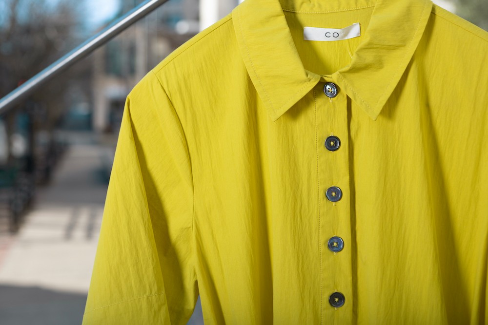 Give your spring wardrobe a playful color boost with this charming shirtdress by CO. The yellowish-green hue reflects all of nature’s new growth and is a fun way to embrace the joy of the changing season.