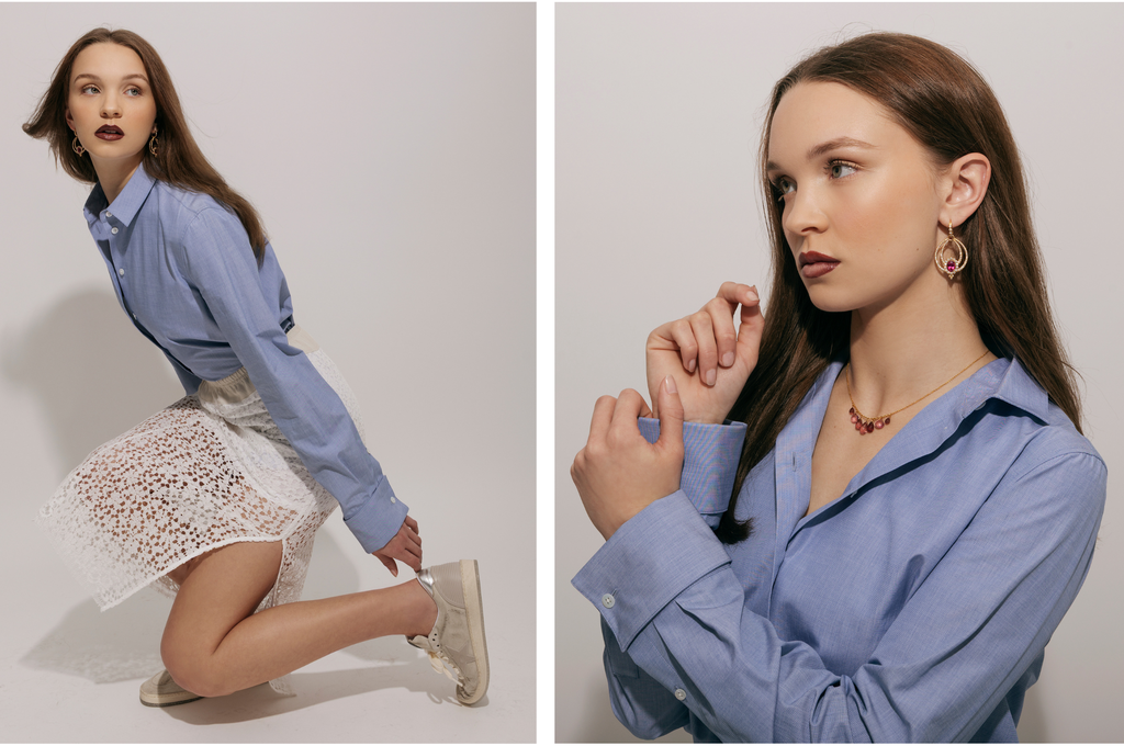 THE ROW cotton button-down shirt, MARIA McMANUS lace ruched skirt, GOLDEN GOOSE Ballstar silver sneakers from B.BARNETT.