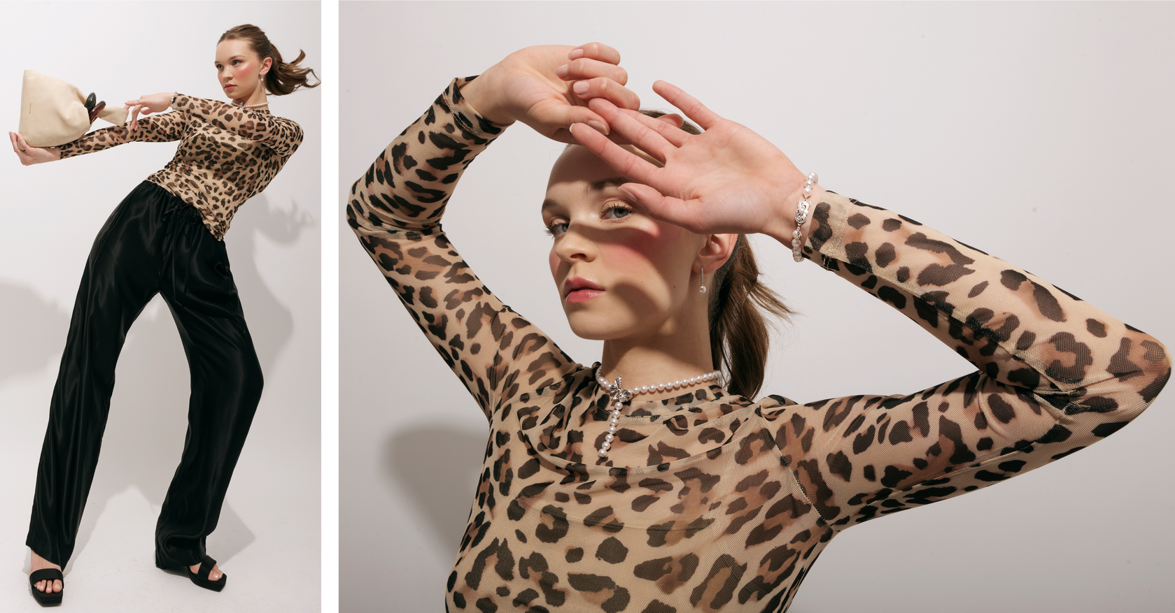 ANATOMIE Juliana print mesh top, KHAITE Rohen black satin pants, VANELI Maida platform sandals, VERONICA BEARD swing clutch from B.BARNETT.