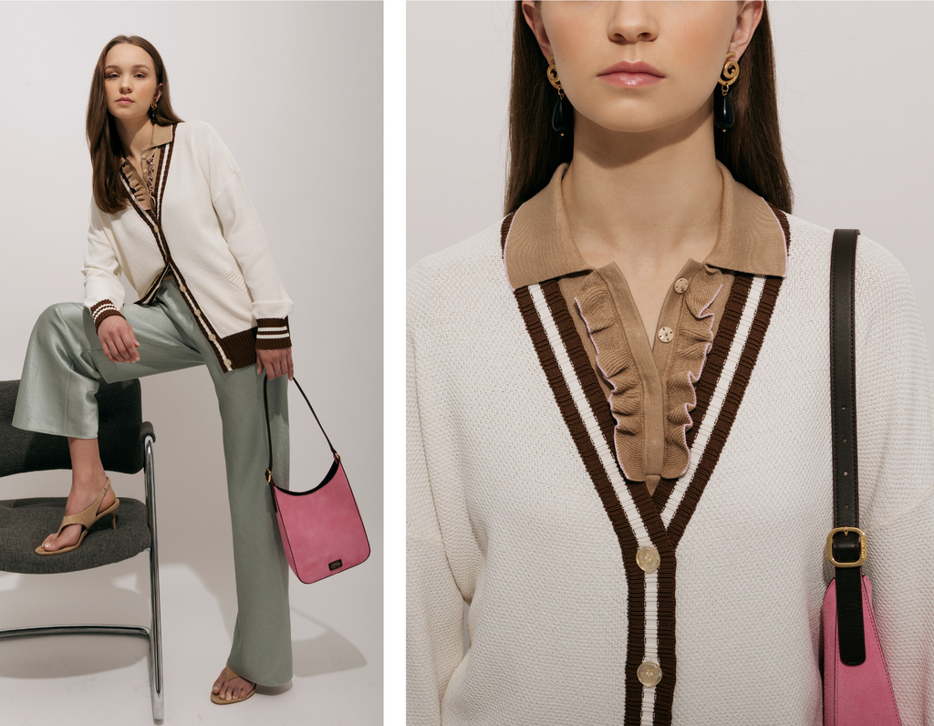 FABIANA FILIPPI trim detail top, ANATOMIE cardigan, VINCE bias high-waist pants, VERONICA BEARD slingback sandals, FRANCES VALENTINE suede bag from B.BARNETT.