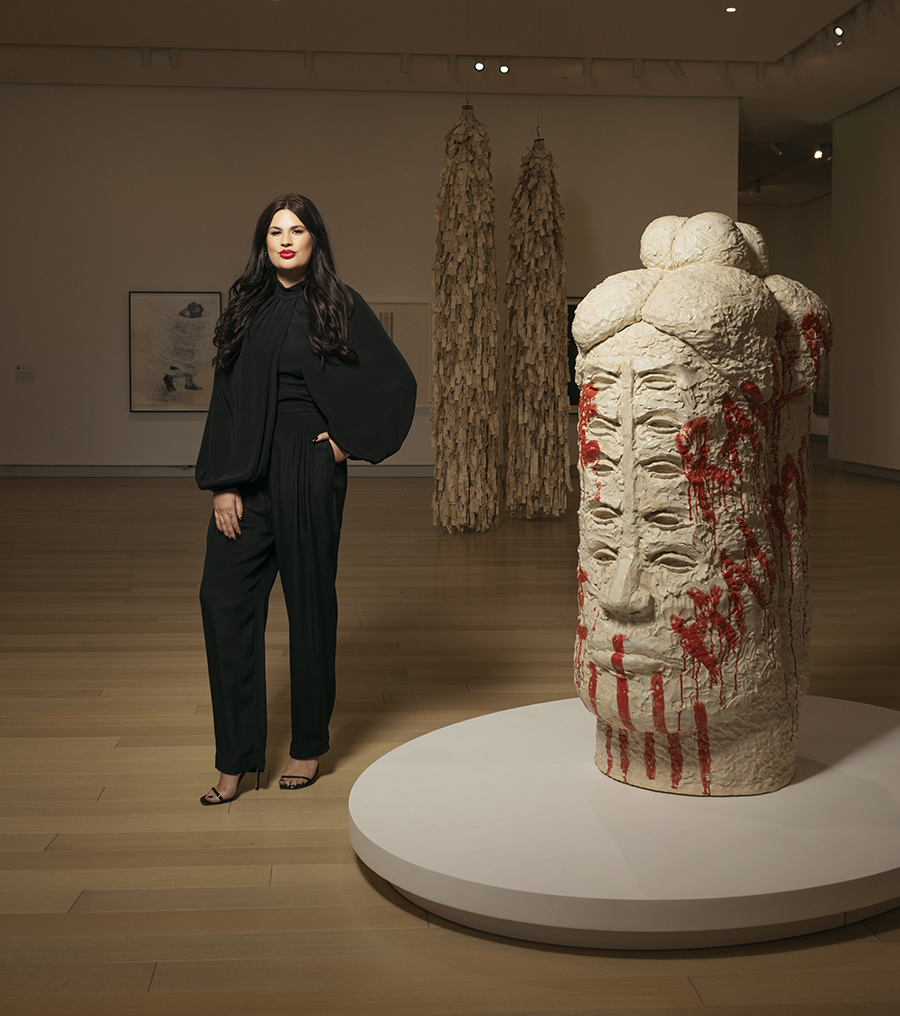 Her imposing sculptures purposefully take up space, the clay often shaped into humanistic forms and baked into neutral earth tones cut with searing splashes of red, each with echoes of her Caddo Nation citizenship.