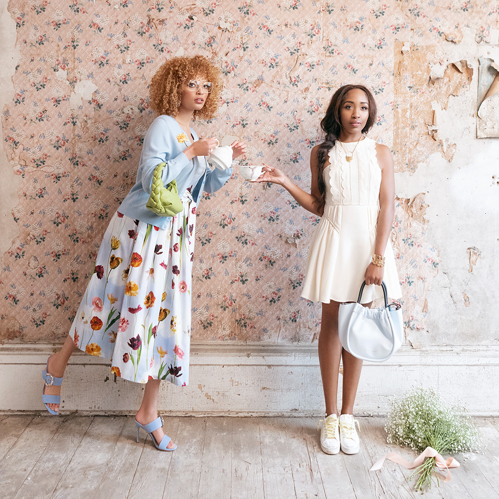 Right: Dress by SELF-PORTRAIT, bag by PROENZA SCHOULER, shoes by GOLDEN GOOSE from B.BARNETT. Jewelry from BOX TURTLE.
