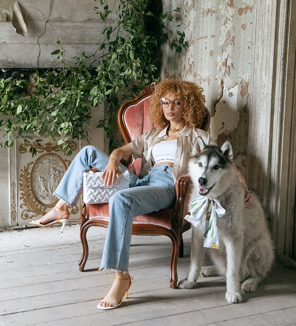 Bra by ANINE BING, top by SILK LAUNDRY, jeans by AGOLDE, shoes by MARYAM NASSIR ZADEH from BEIGE. Glasses by BURBERRY from MCFARLAND EYE CARE. Necklace from BOX TURTLE. Bag by KURT GEIGER from DILLARD’S.
