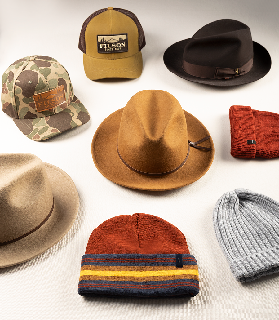 FILSON logger caps, YELLOW 108 fedoras, PENDLETON beanies from DOMESTIC DOMESTIC. BORSALINO felt hat, FEDELI knitted beanie from BAUMANS FINE MEN’S CLOTHING.